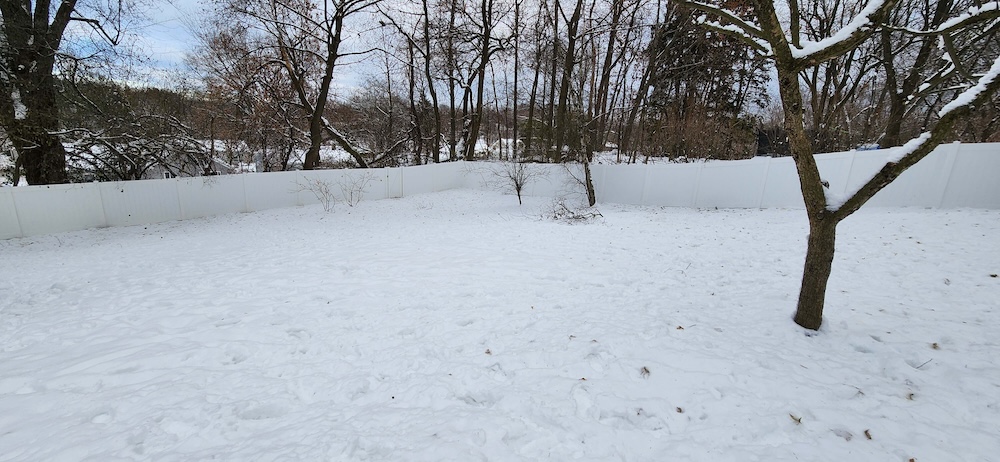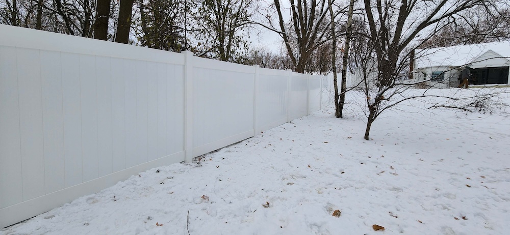 Vinyl Fence Project Providing Backyard Privacy During a Snow Day in Michigan