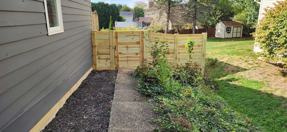 Horizontal wood fence and door installed in a residential backyard by Neiko’s Fence