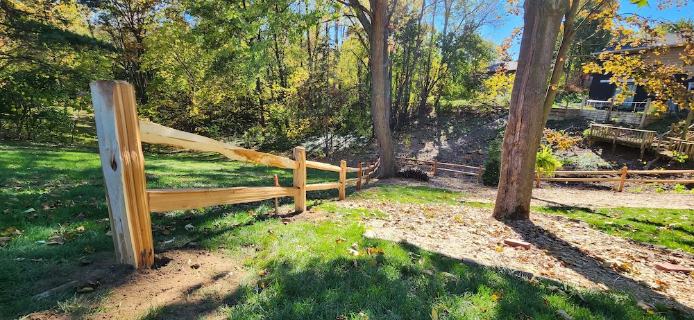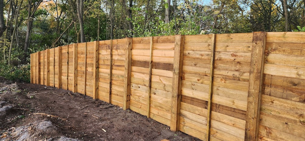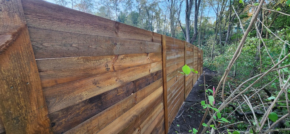 Stained Horizontal Wood Fence Installed in Front of a Michigan Woods Tree Line
